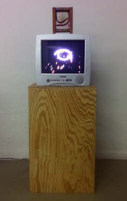 The work consists of several contrasting components, assembled into a kind of audiovisual monument. A silver, 13-inch CRT television rests atop an unpainted plywood box. Surmounting the screen is a small glass and wood display frame, which encloses a short length of rubber hose. The television plays an approximately fifteen-second video on a loop: a glowing image of the hose that spouts an animated fountain of four-pointed amber stars. The accompanying soundtrack features a repetitive bass-heavy track replete with beatboxing, Atari-esque chirps, and electric guitar-like fuzz. The audio emerges not from the television, but from an accompanying pair of PC speakers, and like the pixelated star-stream it flows forth abruptly and then tapers off.